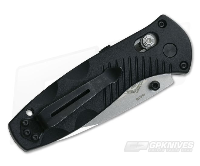 Benchmade 585 Mini Barrage with plain edge 154CM stainless steel blade and Valox handles. Features 420J stainless steel liners and reversible split arrow pocket clip. Completely ambidextrous thumb stud, locking mechanism and pocket clip. Spring assisted model with the Benchmade signature axis lock. Safety for opened and closed positions. Osborne design.