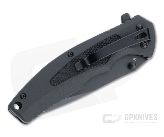 Blade:Â The practical drop point comes with a high hollow grind and tip swedge for optimal performance. Long wearing D2 tool steel is equipped with a durable black coating for discreet use. Assisted deployment is fast and reliable via the dual thumb studs or index flipper.