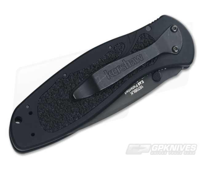 Kershaw Blur with black coated plain edge Sandvik 14C28N stainless steel blade. Black 6061-T6 anodized aluminum handle with trac tec inserts. Dual thumb stud and liner lock. SpeedSafe assisted opening. Stainless steel pocket clip. Designed by Ken Onion.