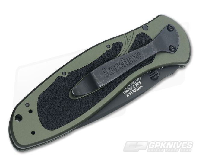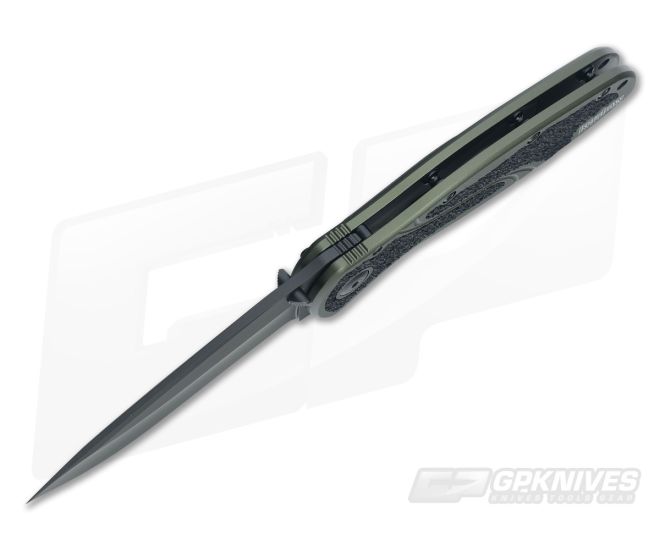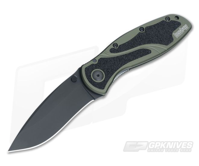 The Kershaw OD Green Blur with black Cerakote coated plain edge Sandvik 14C28N stainless steel blade. Olive drab 6061-T6 anodized aluminum handle with trac tec inserts for a solid grip. Dual thumb stud and liner lock. SpeedSafe assisted opening. Stainless steel reversible pocket clip. Designed by Ken Onion.