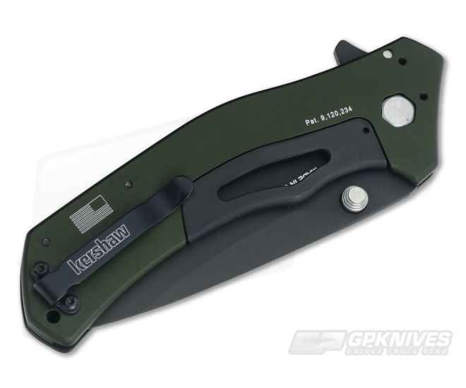 Kershaw Knockout SpeedSafe Assisted knife in OD Green has a unique and innovative locking mechanism. Kershaw has “knocked out” a portion of the Olive anodized aluminum handle to inset a stainless steel plate. The now patented sub-frame lock means this knife has a lightweight aluminum handle, yet the solid lock-up found in a frame lock.