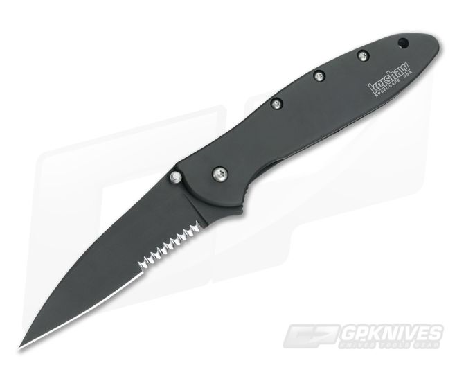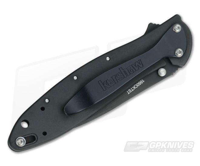 Kershaw Black Leek with partially serrated Sandvik 14C28N stainless steel blade and 410 stainless steel handle. Handle and blade are black non reflective tungsten DLC coated. Dual thumb studs and flipper for easy opening. SpeedSafe assisted opening with frame lock and safety tip lock. Stainless steel pocket clip. Designed by Ken Onion.