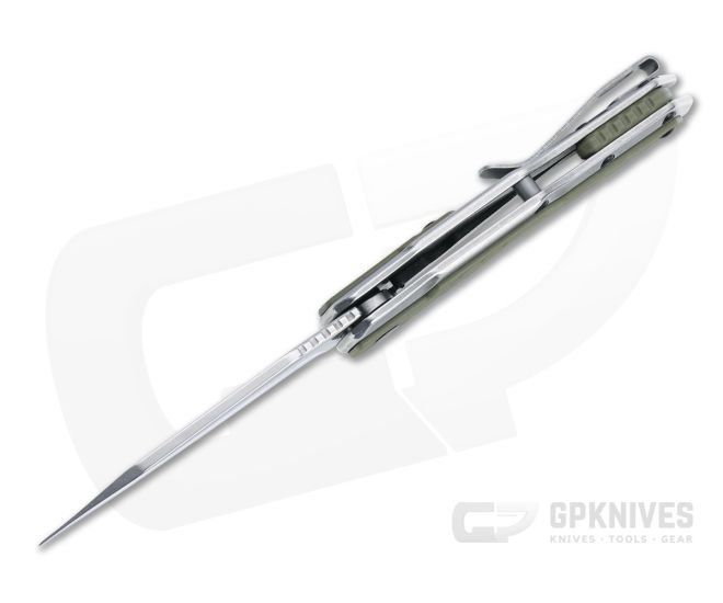 Handle:Â Thick stainless steel slabs come with a heavy stonewashed finish and olive green textured GFN overlays for solid traction and an appealing look. Deep contours on the frame make for a comfortable grip. An integral stainless steel frame lock delivers secure lockup for safe use and smooth operation. In matching olive GFN is a partial back spacer with jimping for grip and an over travel stop on the back of the pivot.Â