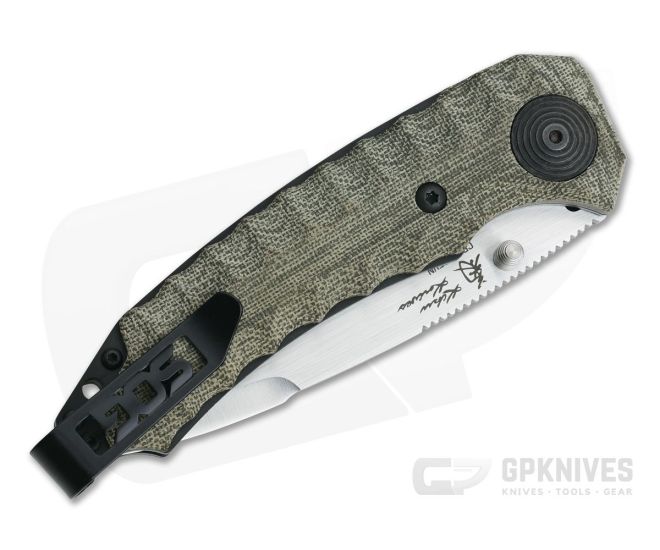Handle:Â Black coated stainless steel liners support warm, rugged, linen Micarta handle scales that have been milled and sculpted with Matsuda style scallops for exceptional comfort and traction in the hand. An index finger groove adds more safety during use while the rear taper of the handle makes it comfortable in multiple grips. Simple and intuitive, the button lock provides solid lock up and secure operation. A generous hole is provided for lanyard attachment at the pommel.