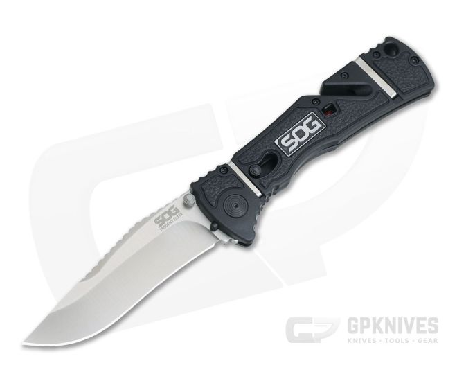 With a built-in slot cutter and glass breaker the SOG Trident Elite is a purpose built assisted opening folder that was designed to handle any emergency with speed. Featuring patented SOG Assisted Technology for fast one-handed operation, the AUS-8 stainless steel blade is ready at a moments notice and capable of handing whatever comes your way. This version comes with a satin finished Clip Point blade and Black GRN handles.